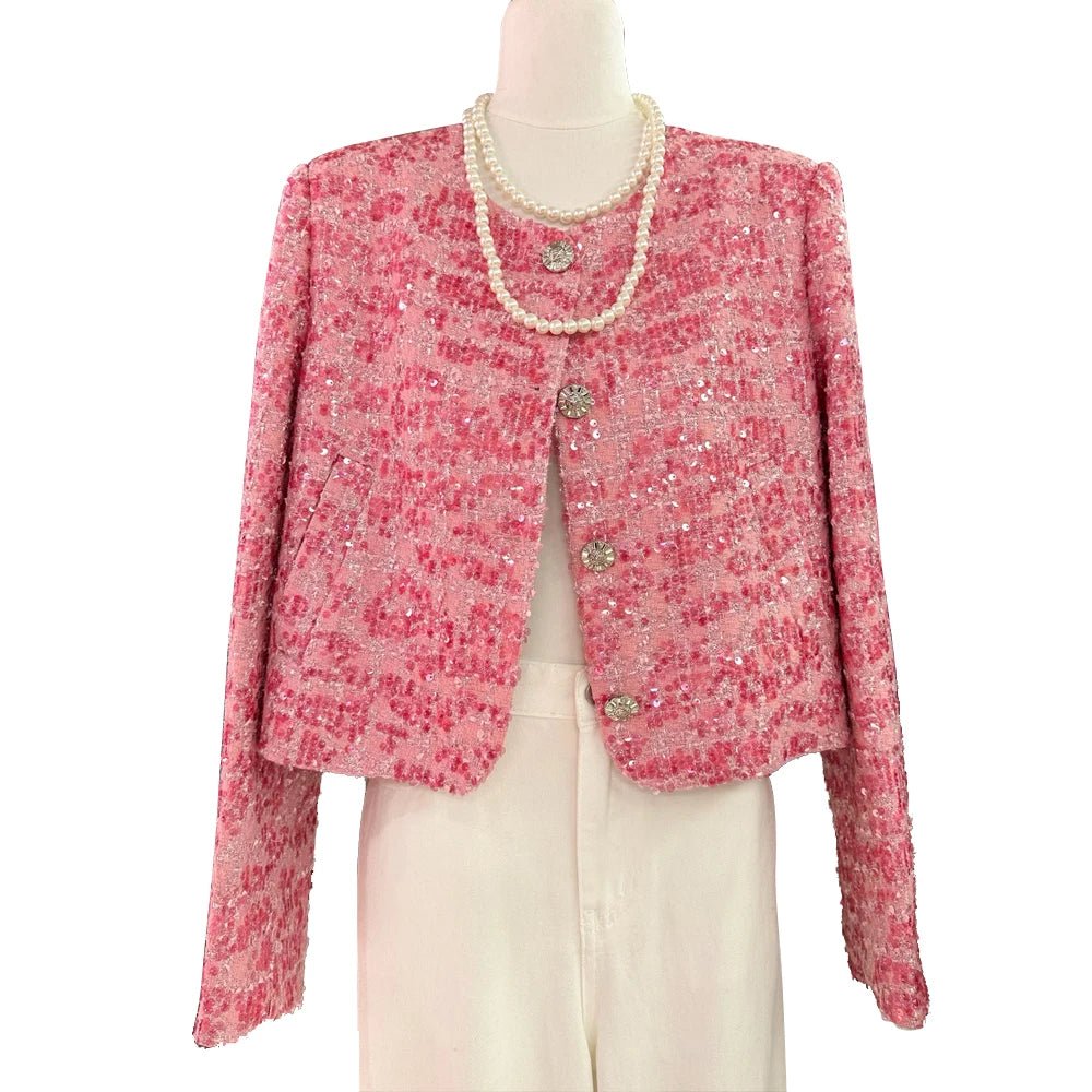 Whether you're heading to a cocktail party, a night out with friends, or simply want to add some sparkle to your wardrobe, this Luxury Pink Sequined jacket is a must-have. Make a bold fashion statement and embrace your inner fashionista with this stunning piece today!