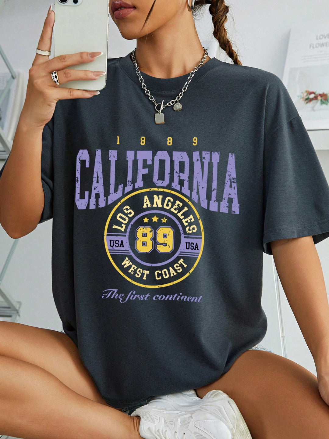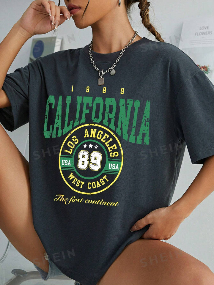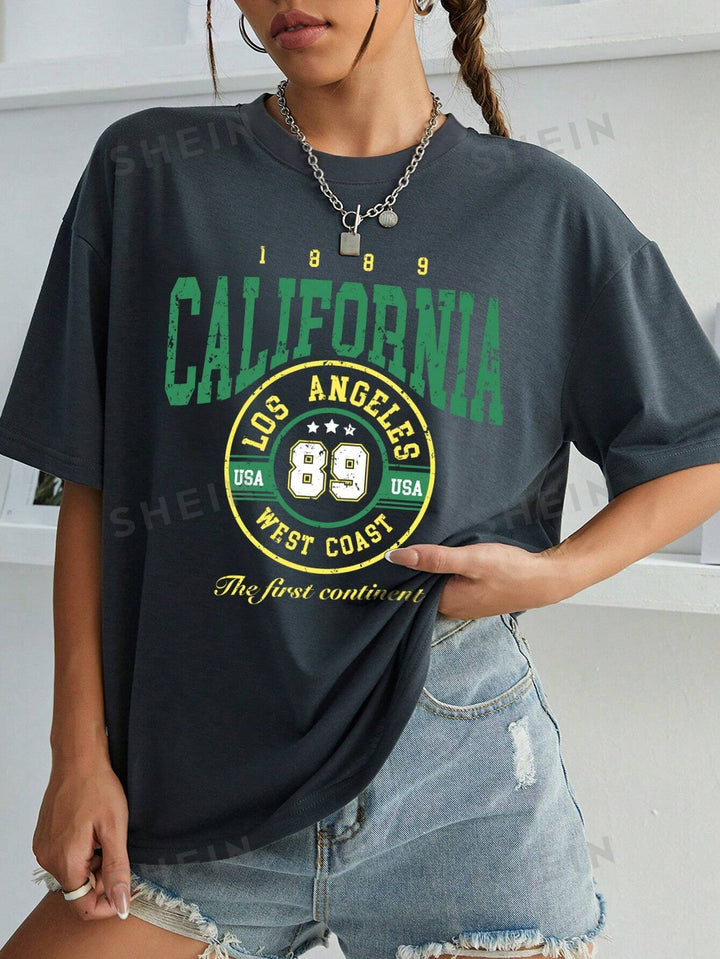 SHEIN Essnce Leisure Vacation Style Letter Pattern, Drop Shoulder Round Neck Retro Gray T-Shirt, Casual Short Sleeve For Back To School Season