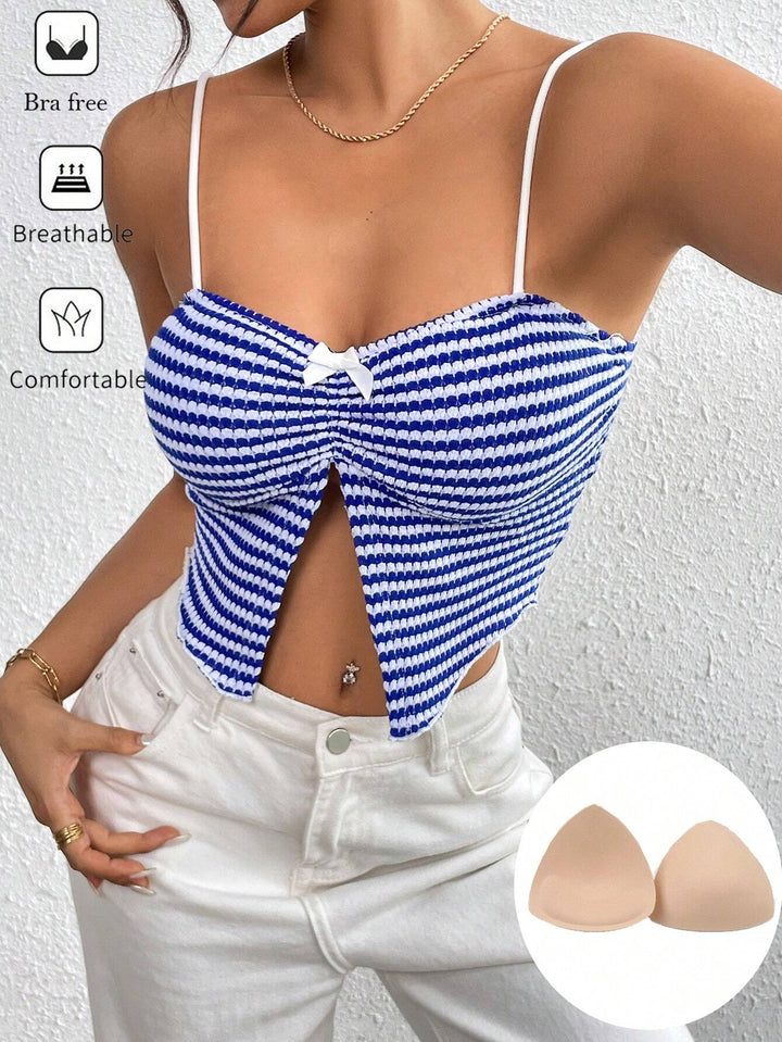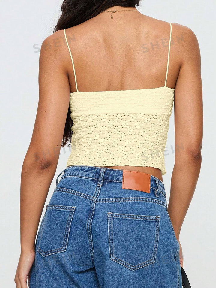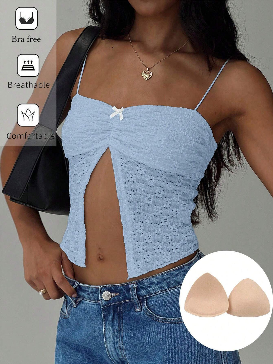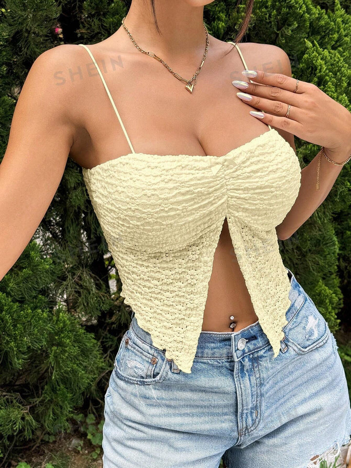 SHEIN Essnce Summer Cool And Textured Pleated Cami Top With Chest Cup Design, Slit In Front And Middle, Thin Straps