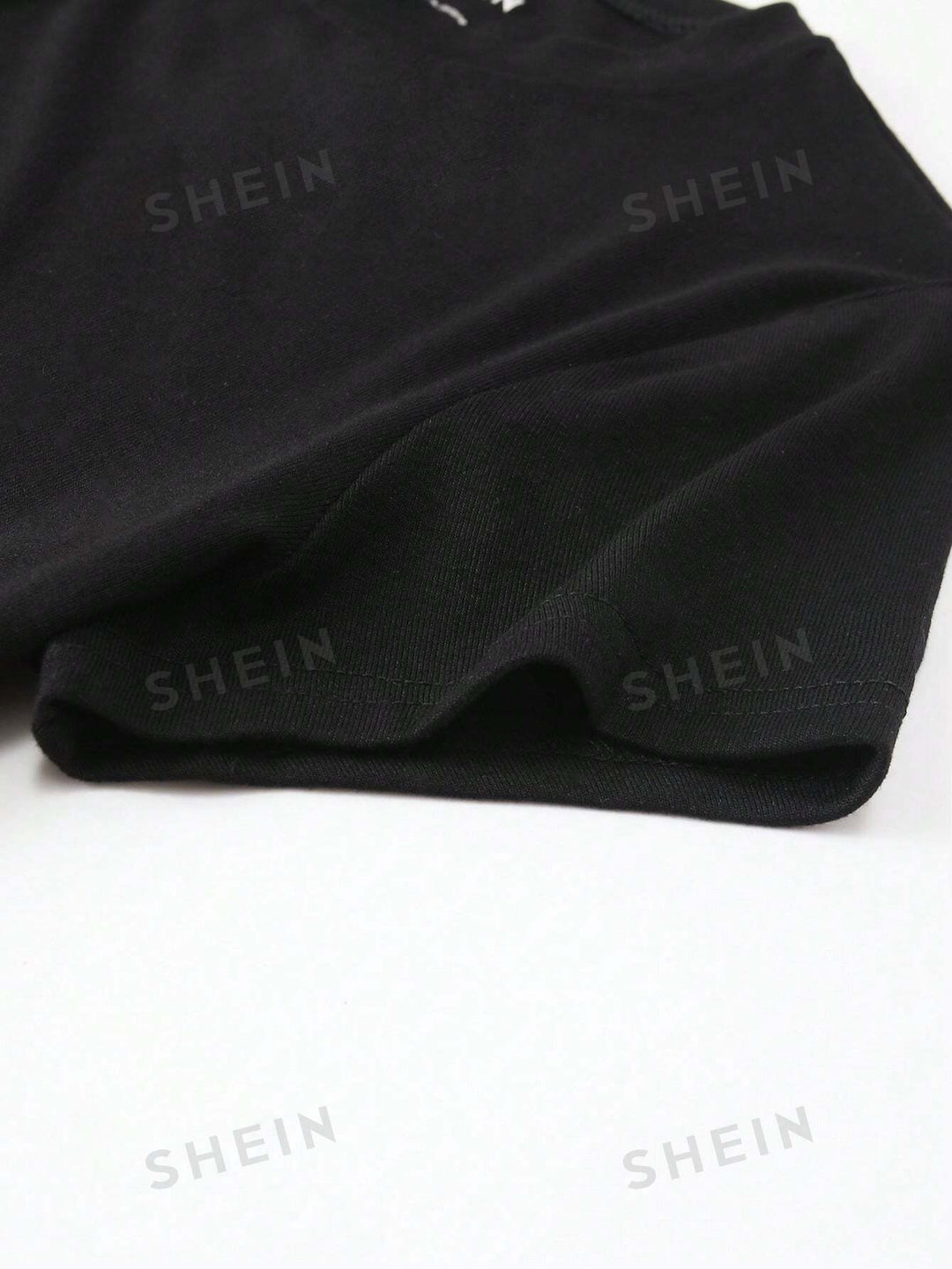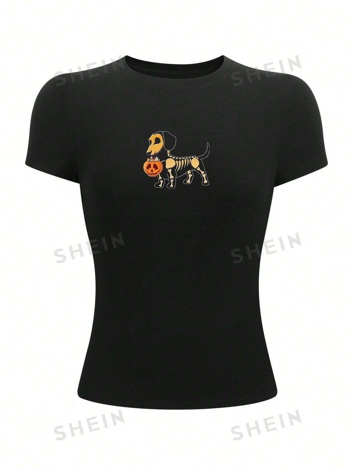SHEIN EZwear Women Black Crew Neck T-Shirt With Pumpkin & Puppy Print For Halloween