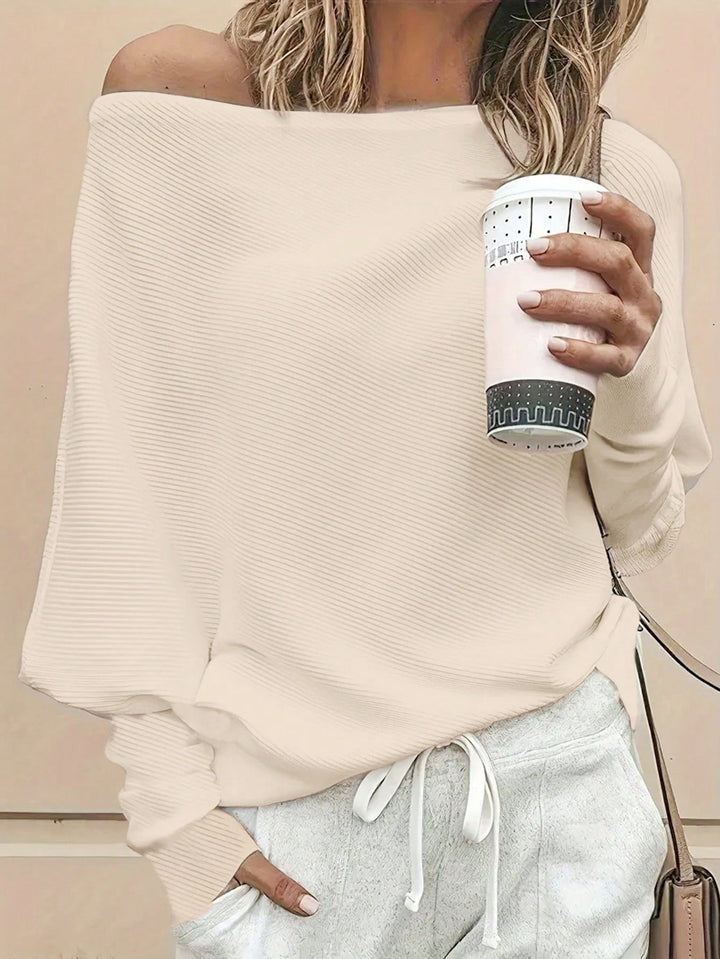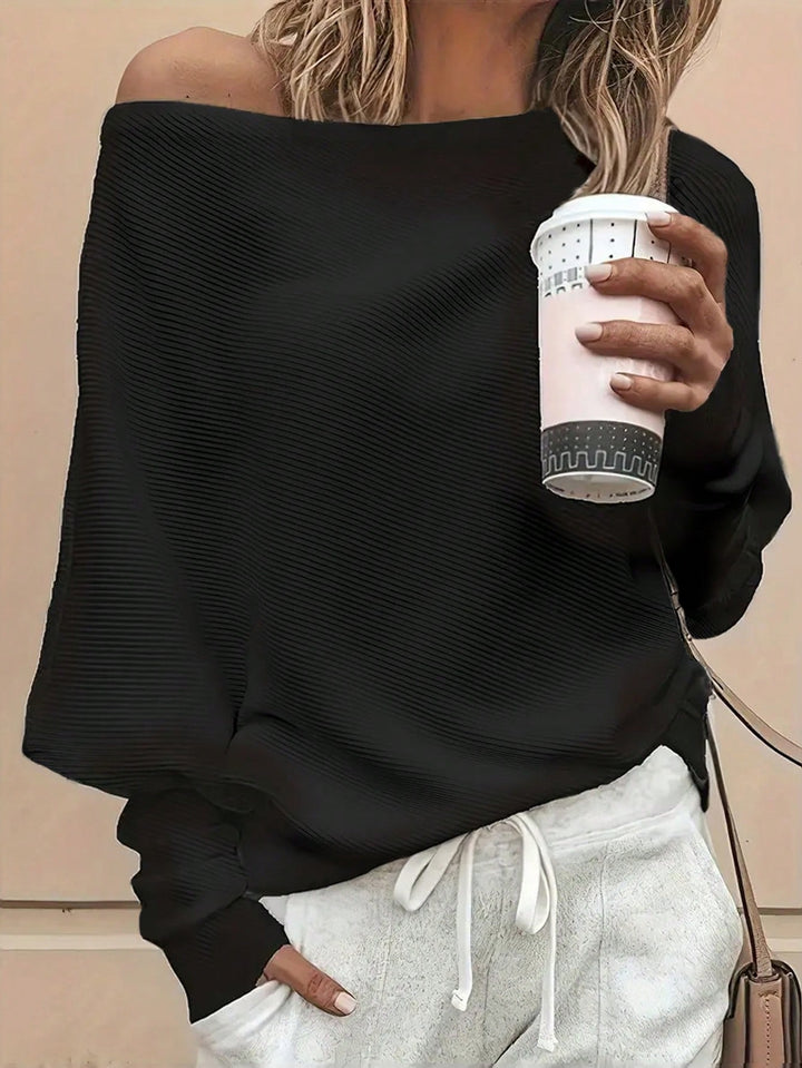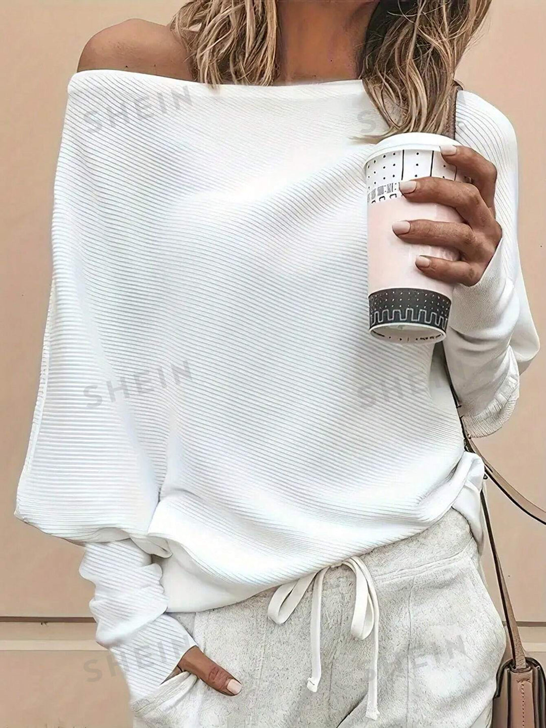 SHEIN LUNE Women's Spring/Summer Solid Color Asymmetrical Collar Batwing Long Sleeve Loose Casual T-Shirt