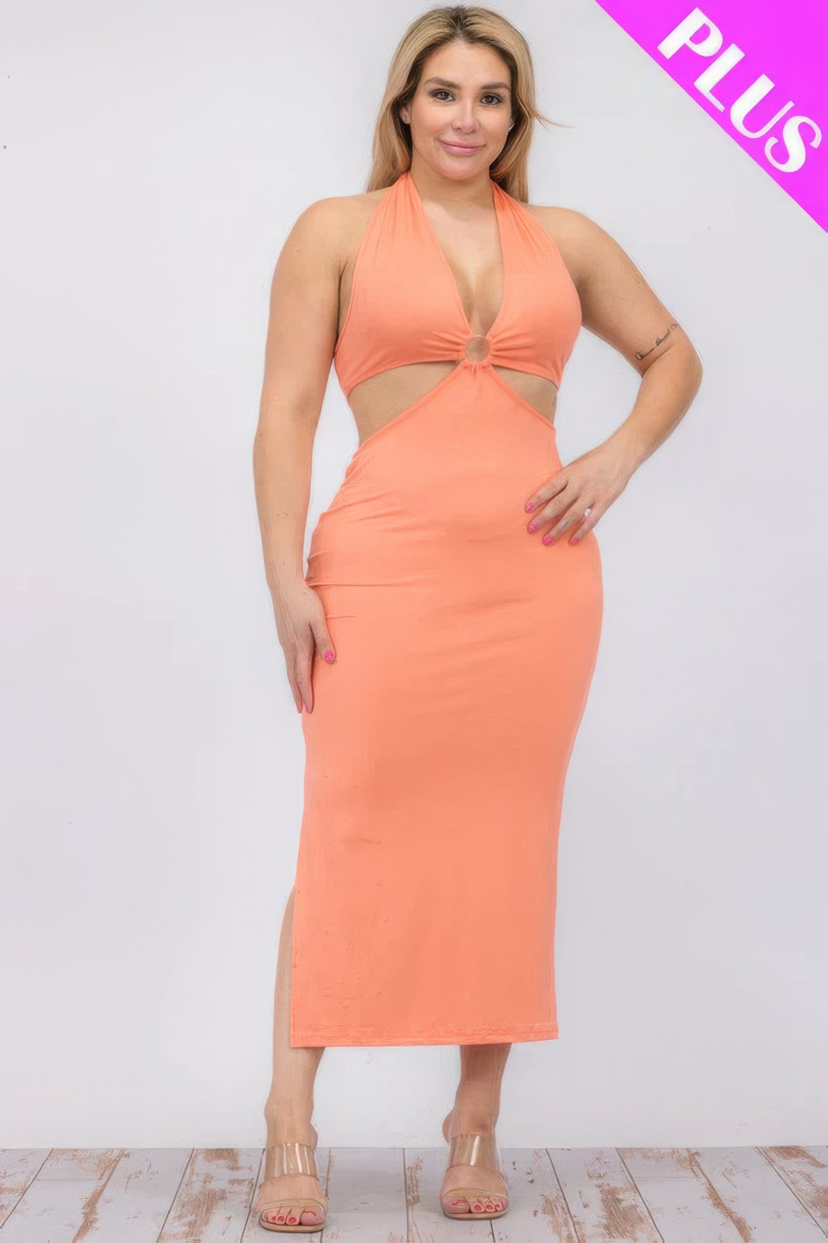 Elevate your wardrobe with our Plus Size Cut-out Halter Neck Double Back Tie Split Thigh Midi Dress, a timeless piece that effortlessly combines style and comfort. Crafted with the utmost care and attention to detail, this garment is designed to make you look and feel your best.