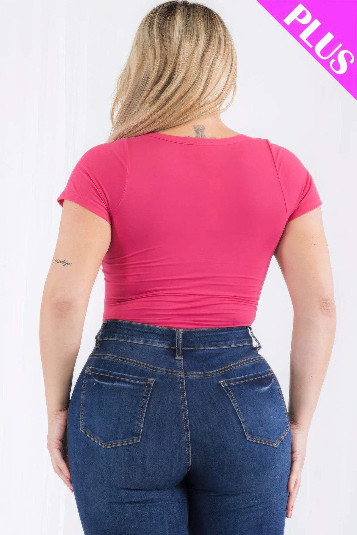 Add a burst of color to your wardrobe with the Plus Size Casual Split Neck Solid Short Sleeve Bodysuit in Poinciana. Order now to enjoy a stylish and comfortable piece!