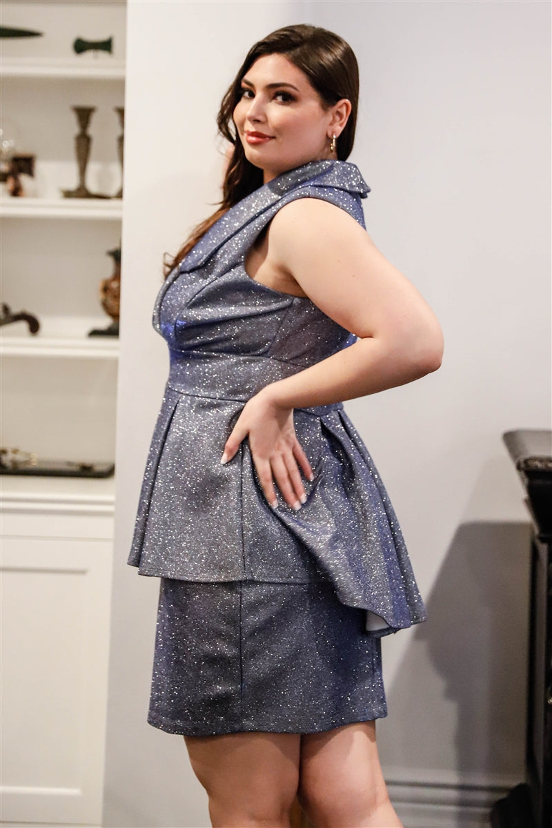 Get ready to shine with our Plus Glitter Collared Peplum Mini Dress in Royal. Add it to your cart now and experience the perfect blend of style and elegance!