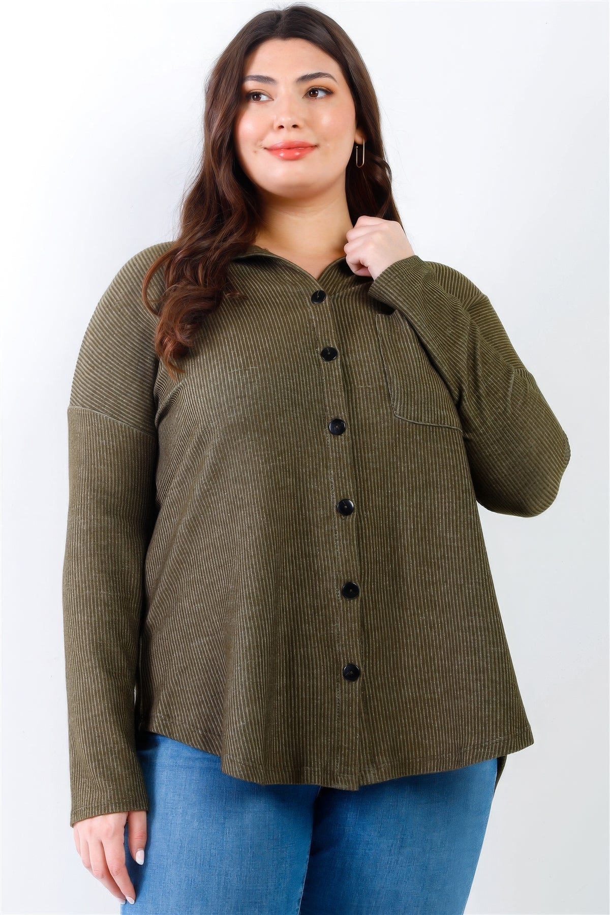 Get ready to showcase your style with our Plus Black Ribbed Collared Button Up Shirt Top in Olive. Add it to your cart now and experience the perfect blend of fashion and comfort!